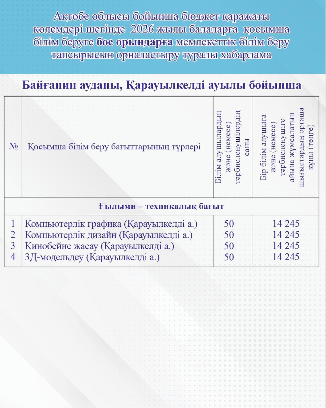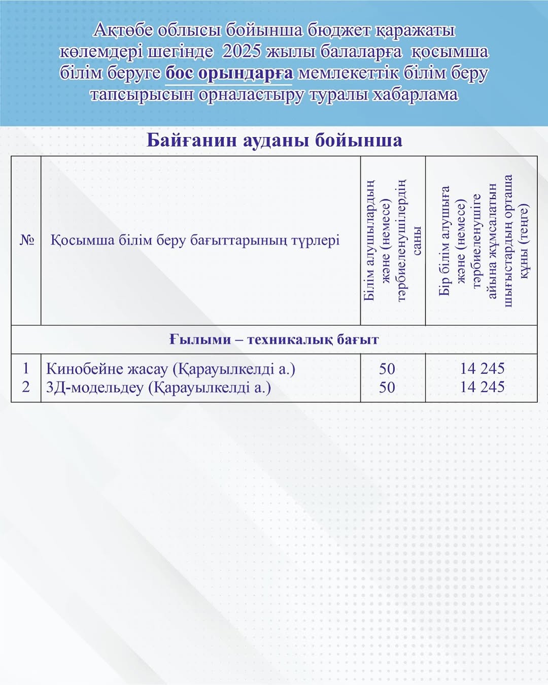 2025 жылғы 13 - 17 қаңтар аралығында балаларға қосымша білім беру бағдарламаларын іске асыратын ұйымдардан Байғанин ауданы бойынша бос орындарға мемлекеттік білім беру тапсырысын орналастыруға өтініштер https://darabala.kz платформасында қабылданады.